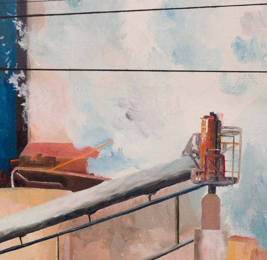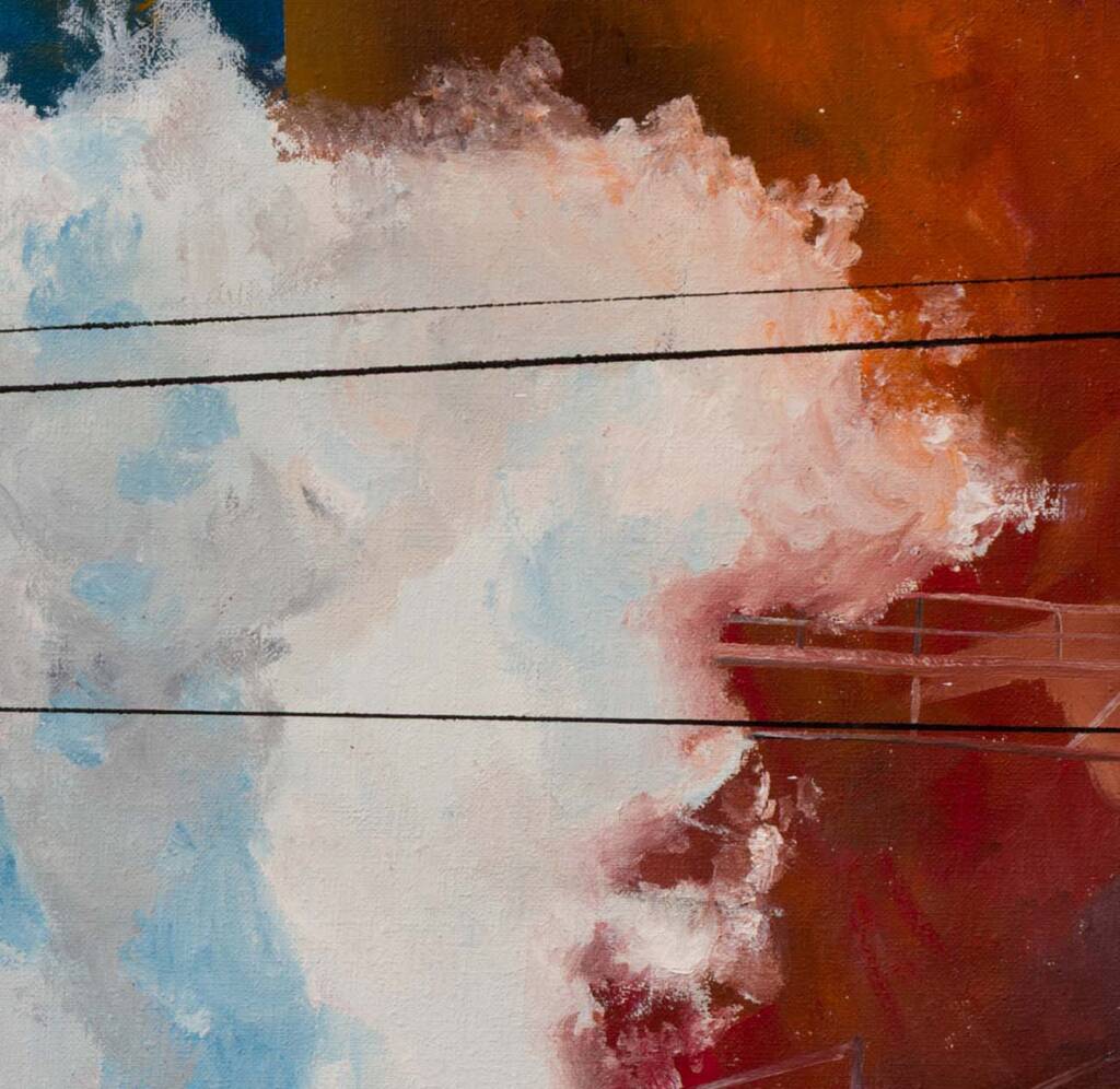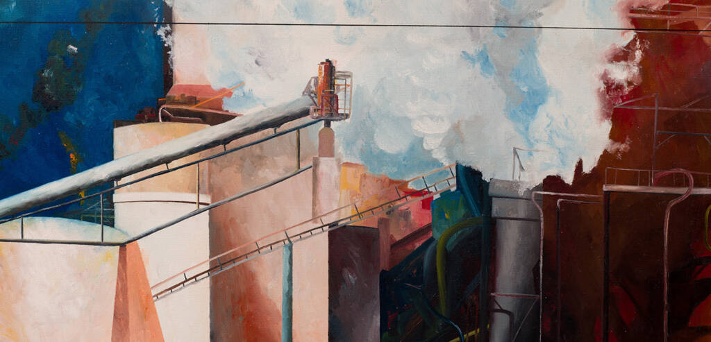 Vapore bianco esplode al centro della tela tra strutture metalliche, tubazioni e volumi in terra bruciata e blu intenso. Sambuchi coglie l’impianto nel pieno della sua attività, restituendo con forza cromatica l’energia caotica e potente della produzione industriale in corso.