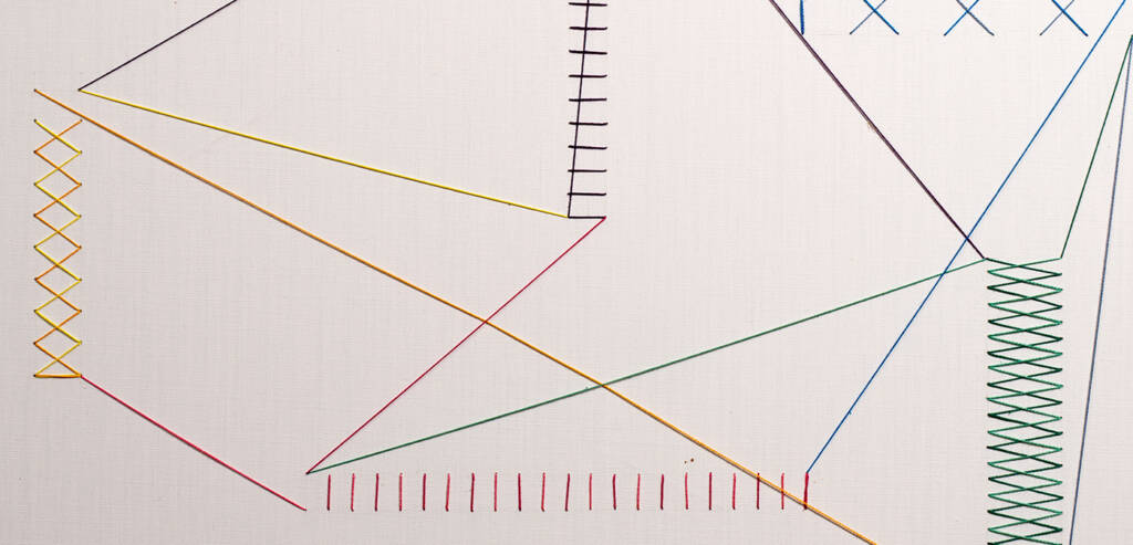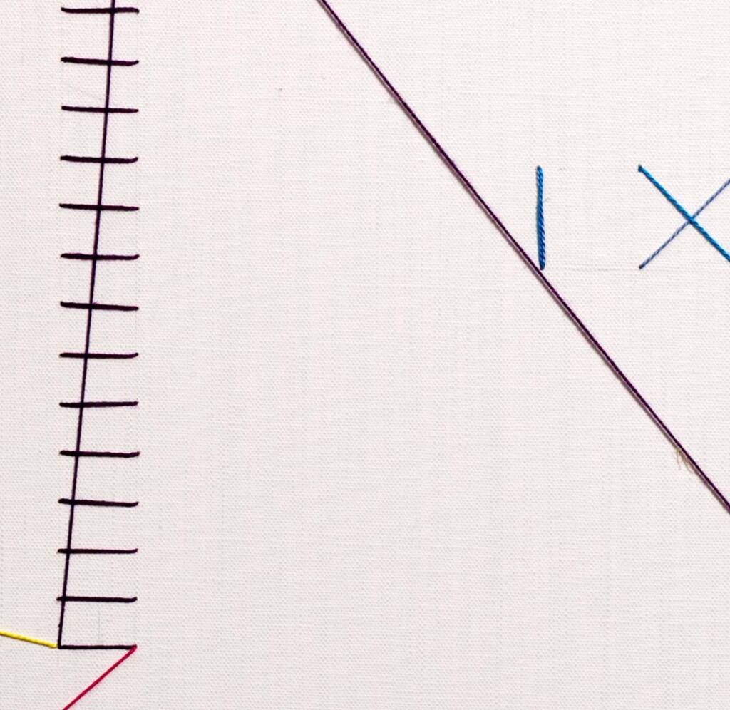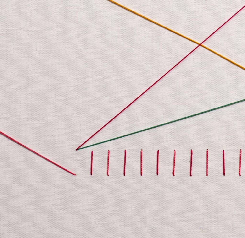 Linee di filo colorato — giallo, rosso, verde, blu, viola — tracciano geometrie leggere e precise sulla tela bianca, intrecciandosi in nodi, croci e sequenze ritmiche. Il gesto sartoriale diventa disegno astratto, sospeso tra rigore matematico e delicatezza artigianale.