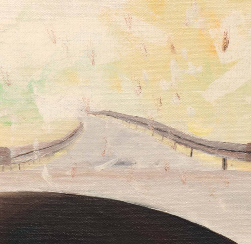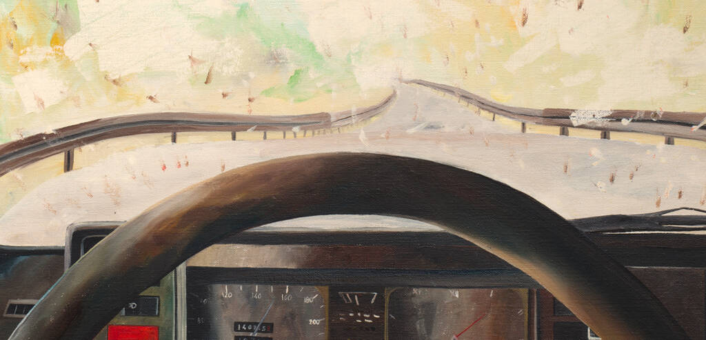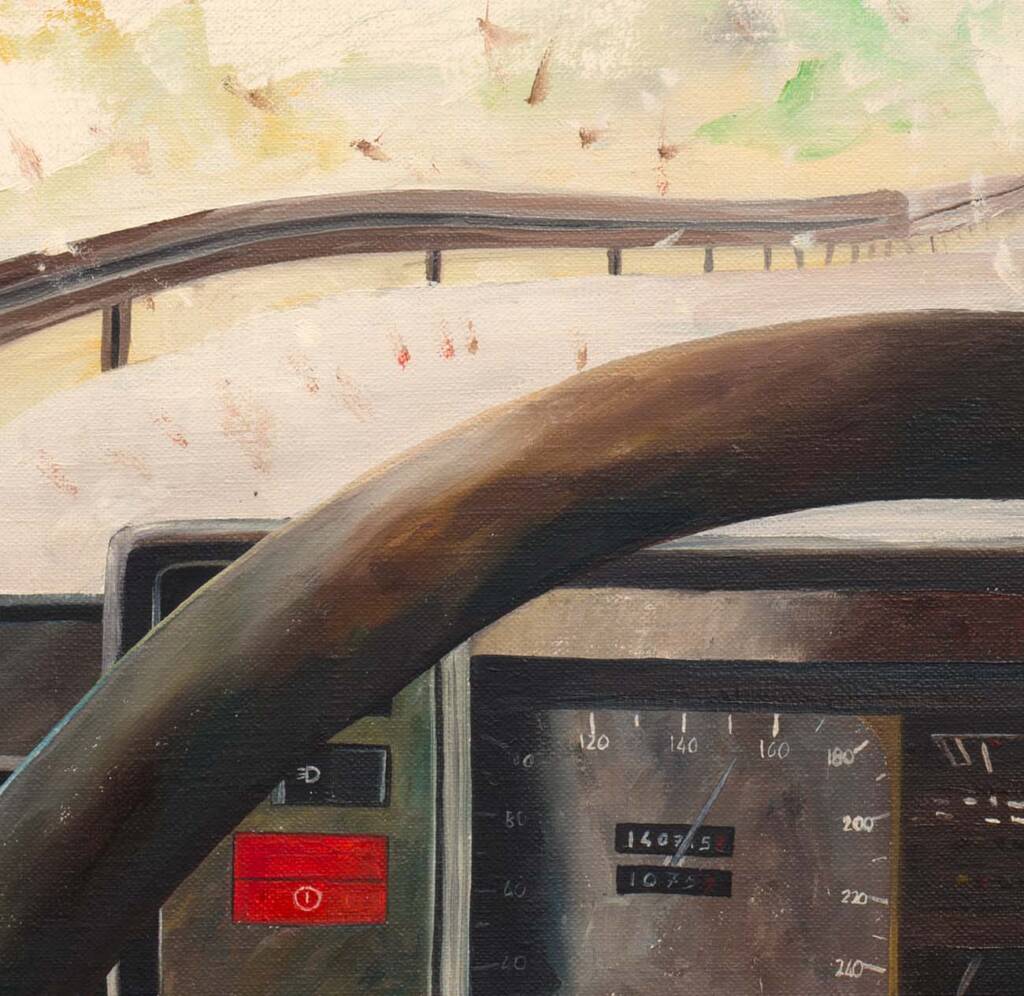 Il punto di vista è quello del guidatore: il volante, il cruscotto, e oltre il parabrezza sporco di insetti una strada che si perde nella luce. Sambuchi trasforma un momento banale del viaggio in pittura, catturando la stanchezza e il senso di attesa del rientro a casa.