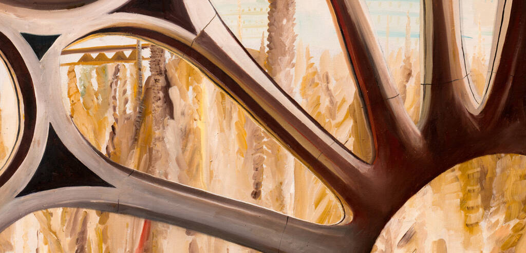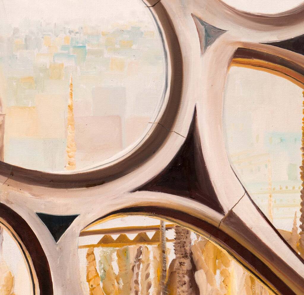 Sambuchi si avvicina fino a perdere la prospettiva d’insieme: ciò che rimane sono le forme organiche della pietra gaudiana, cerchi e curve che si intrecciano come rami. Attraverso le aperture, Barcellona e le guglie della cattedrale affiorano come visioni lontane, filtrate da un’architettura che è già natura.