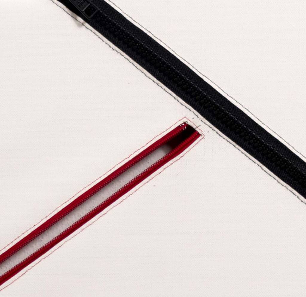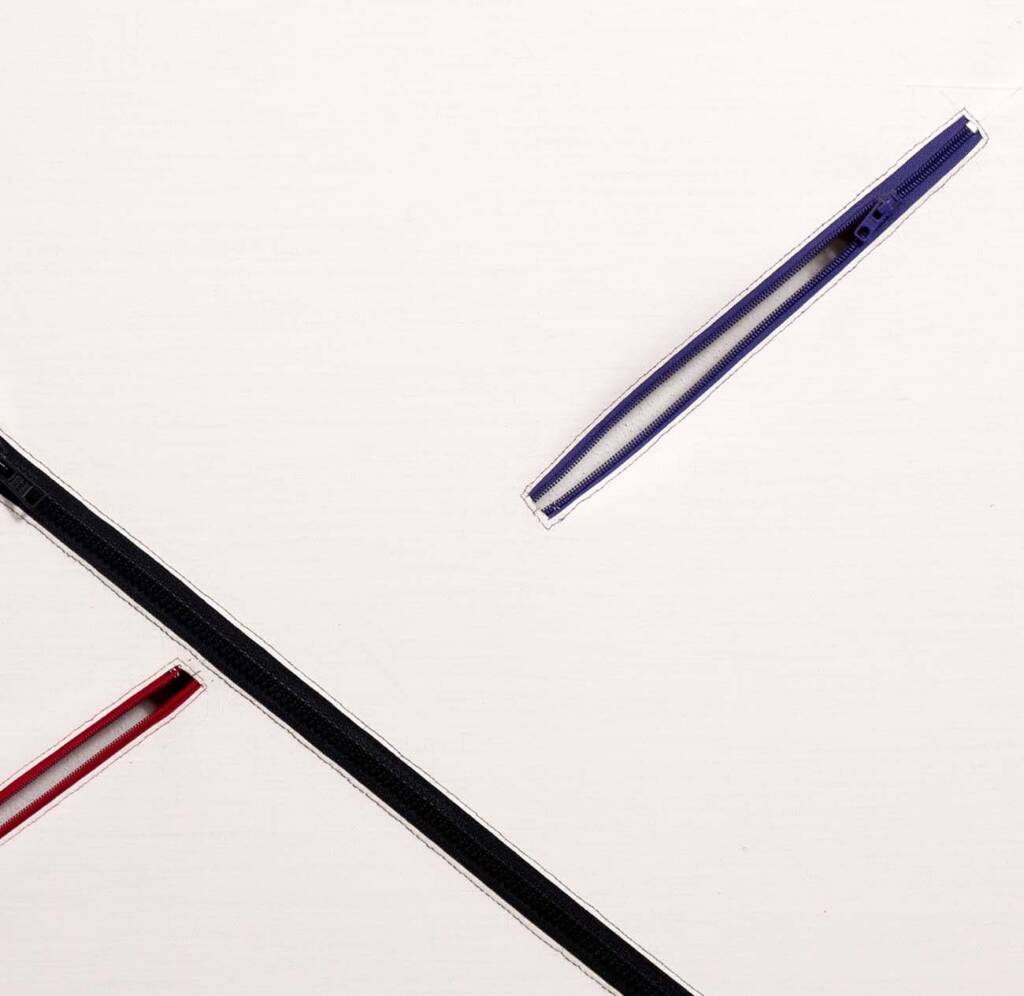 Tre cerniere — nera, rossa e blu — si dispongono sulla tela bianca come tagli netti e intenzionali, richiamando Fontana nella tensione tra superficie e lacerazione. Il segno minimo basta a trasformare il supporto in campo di forze, sospeso tra apertura e chiusura.