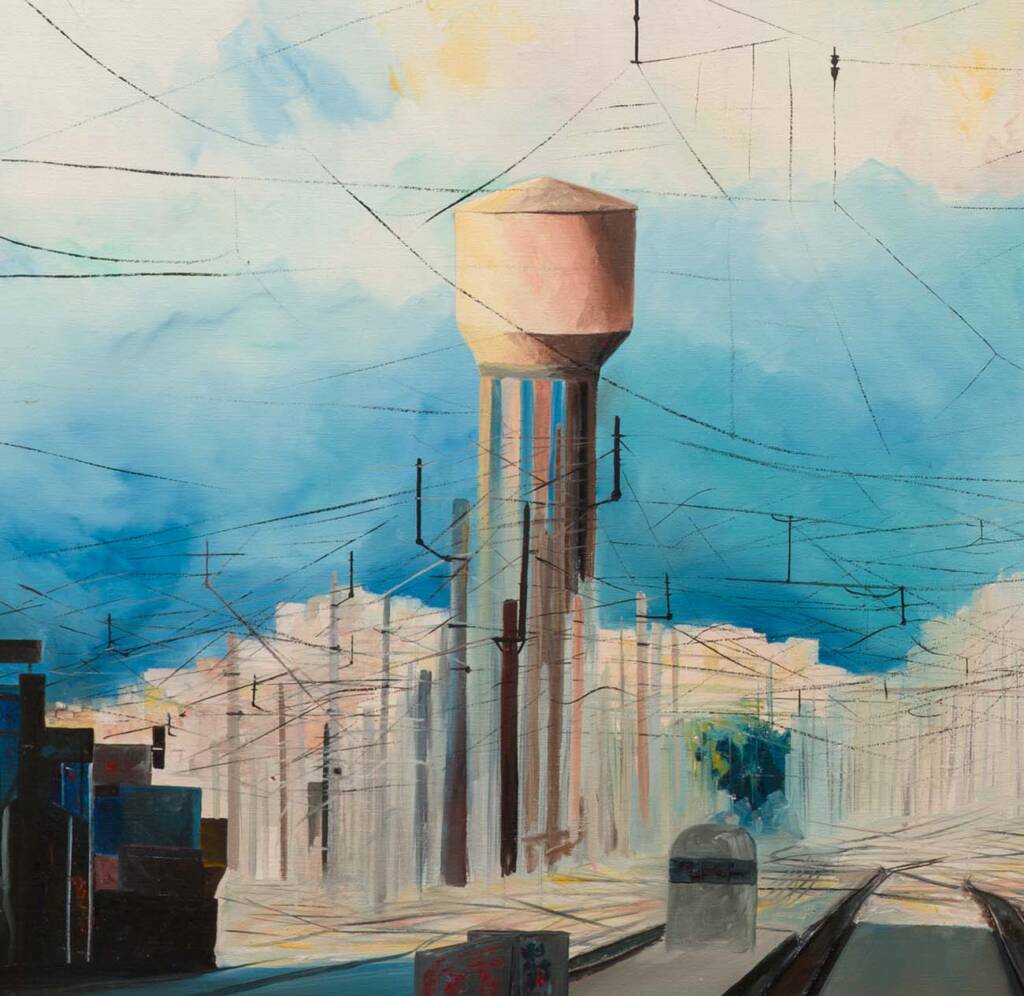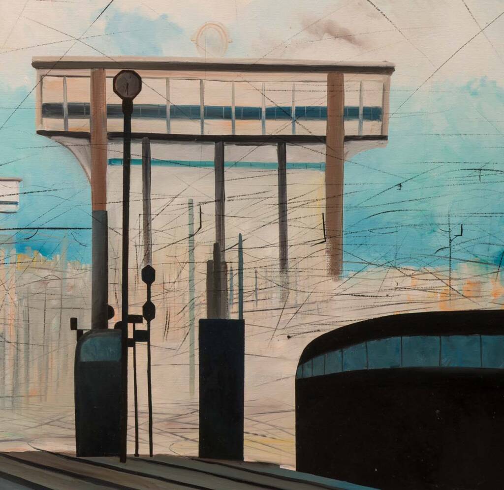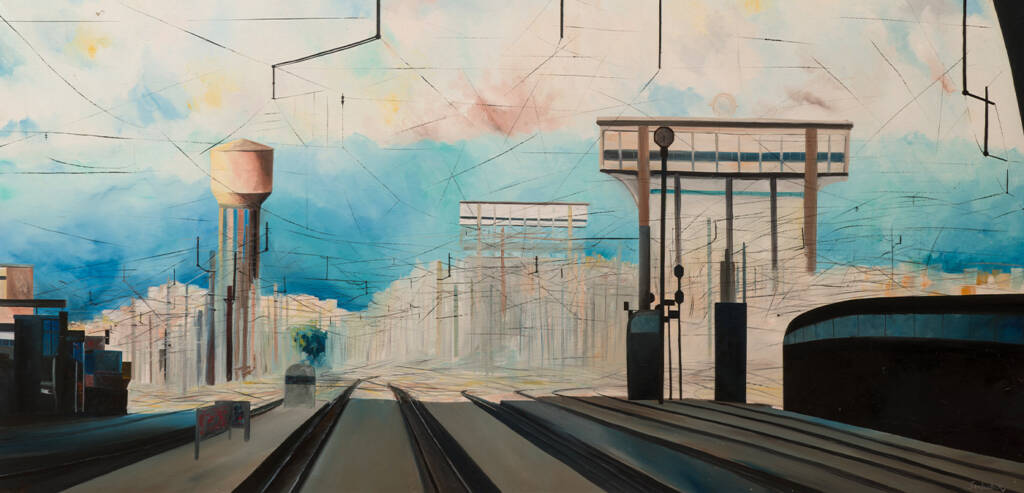 I binari convergono verso un orizzonte luminoso e sfumato, mentre una fitta ragnatela di cavi elettrici disegna segni grafici nel cielo azzurro e rosato. Sambuchi restituisce la geometria sospesa e quasi metafisica del fascio ferroviario milanese, tra attesa, movimento e luce rarefatta.
