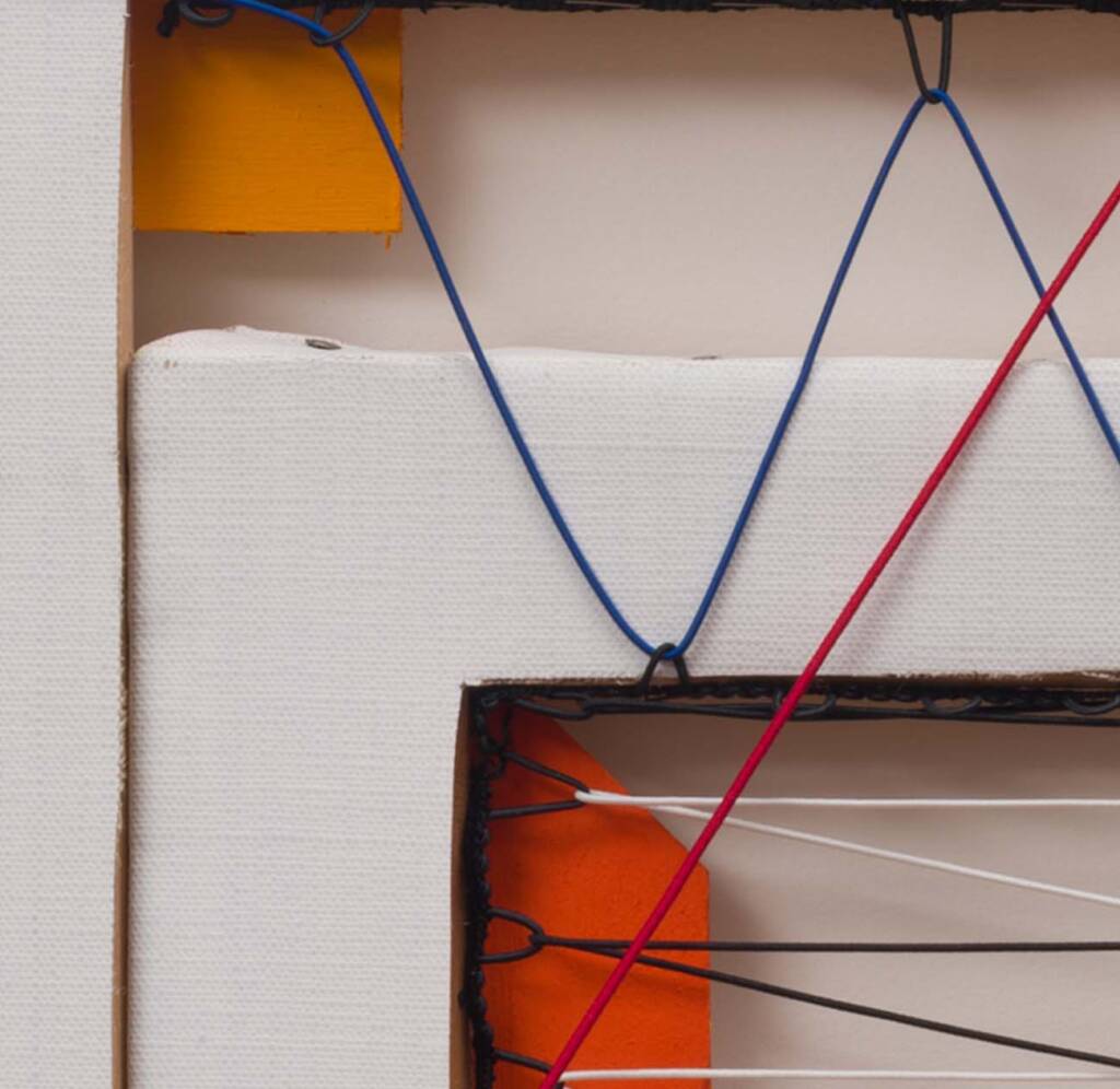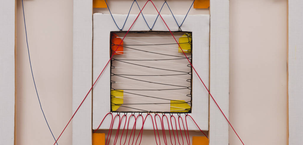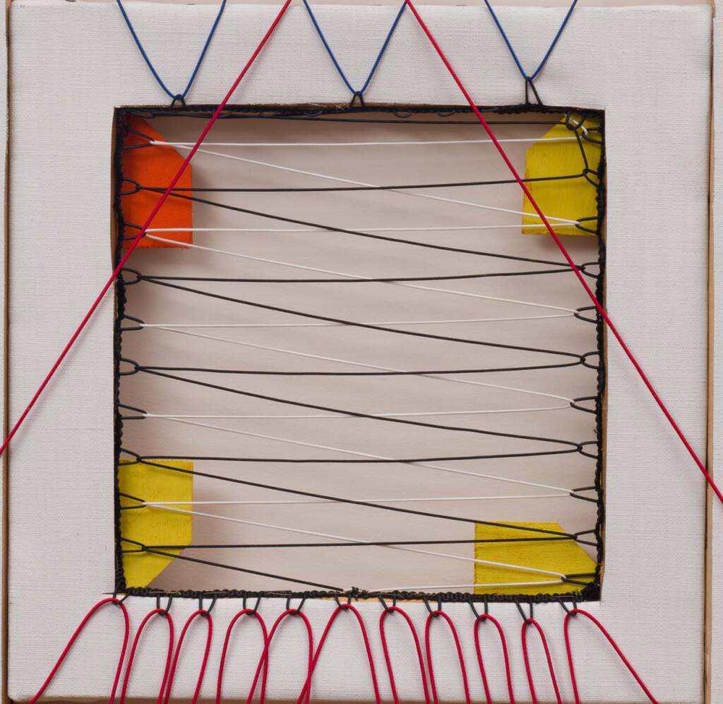 Telai concentrici rivelano la propria struttura interna, mentre fili rossi, blu, bianchi e neri li attraversano creando geometrie tese e vibranti. Sambuchi porta il retro della tela in primo piano, trasformando l’ossatura nascosta dell’opera in protagonista assoluta della composizione.
