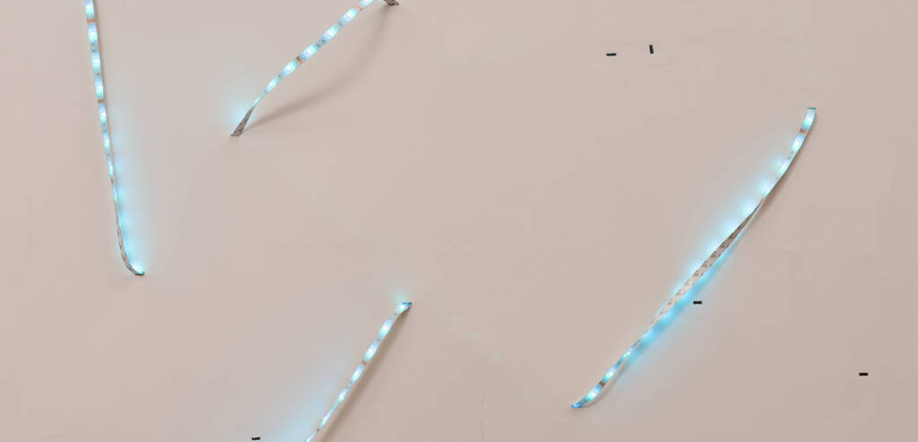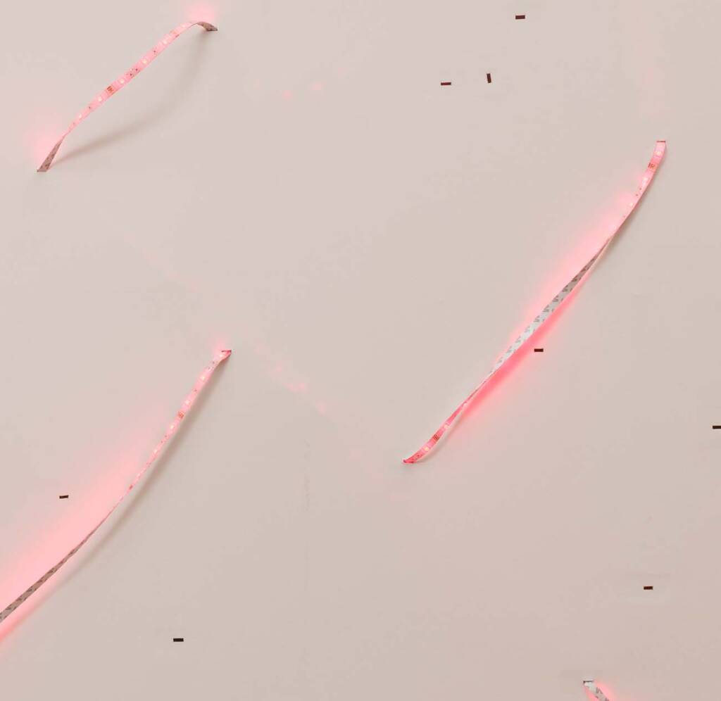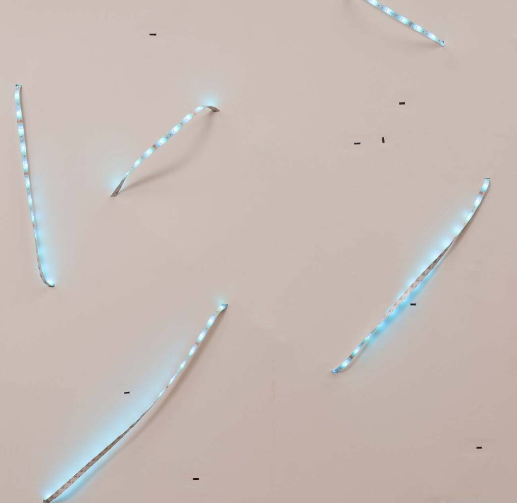 Strisce LED curve si dispongono sulla tela come segni grafici luminosi, mutando dall’azzurro al rosa al variare delle accensioni. Lo spettatore può modificare intensità e colori, trasformando ogni interazione in una composizione inedita dove la luce diventa pennello e il gesto diventa pittura.