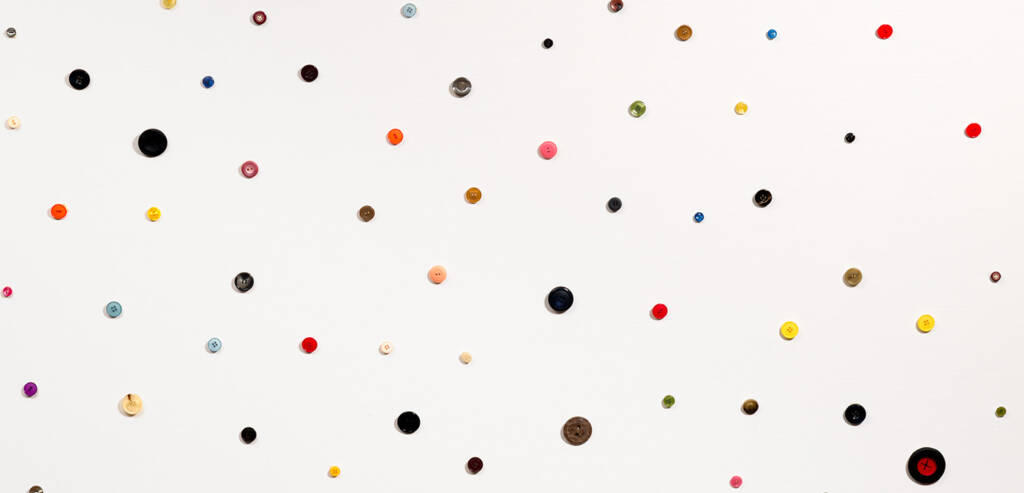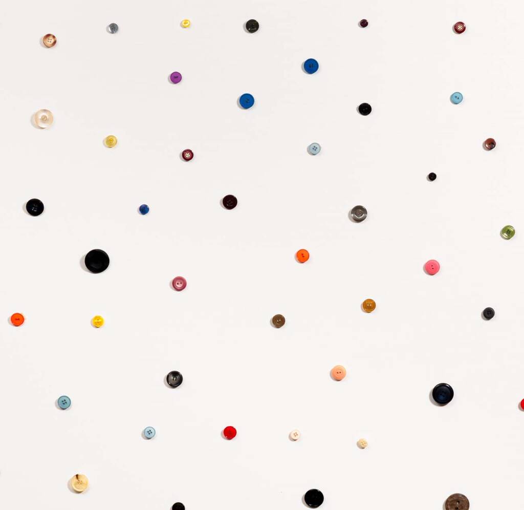 Centinaia di bottoni colorati di forme e dimensioni diverse si distribuiscono liberamente sul bianco della tela come una costellazione allegra e domestica. Ogni elemento porta con sé una storia minima e quotidiana, trasformando il frammento di abiti vissuti in composizione cromatica e poetica.