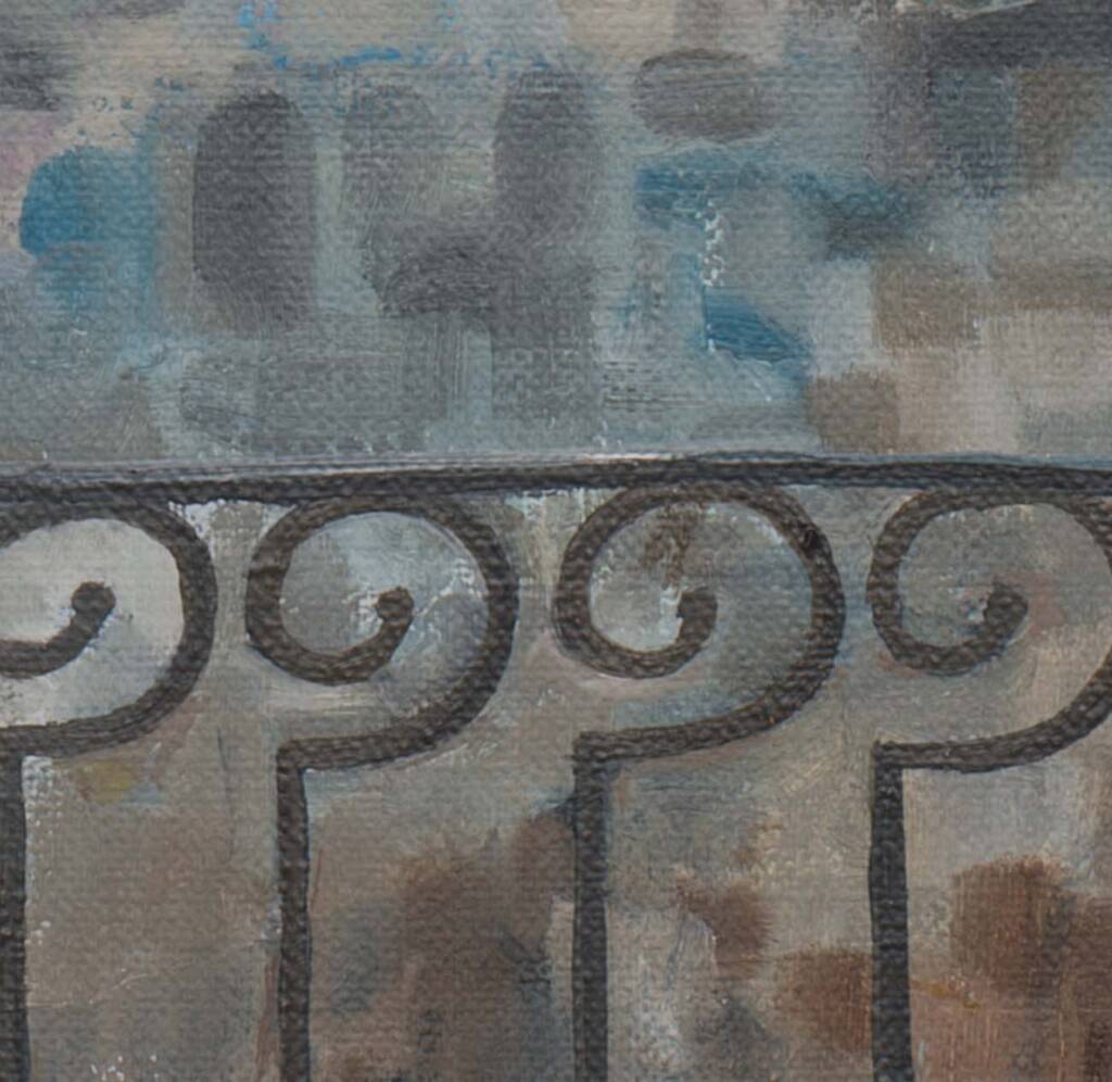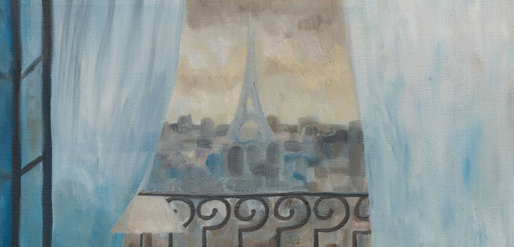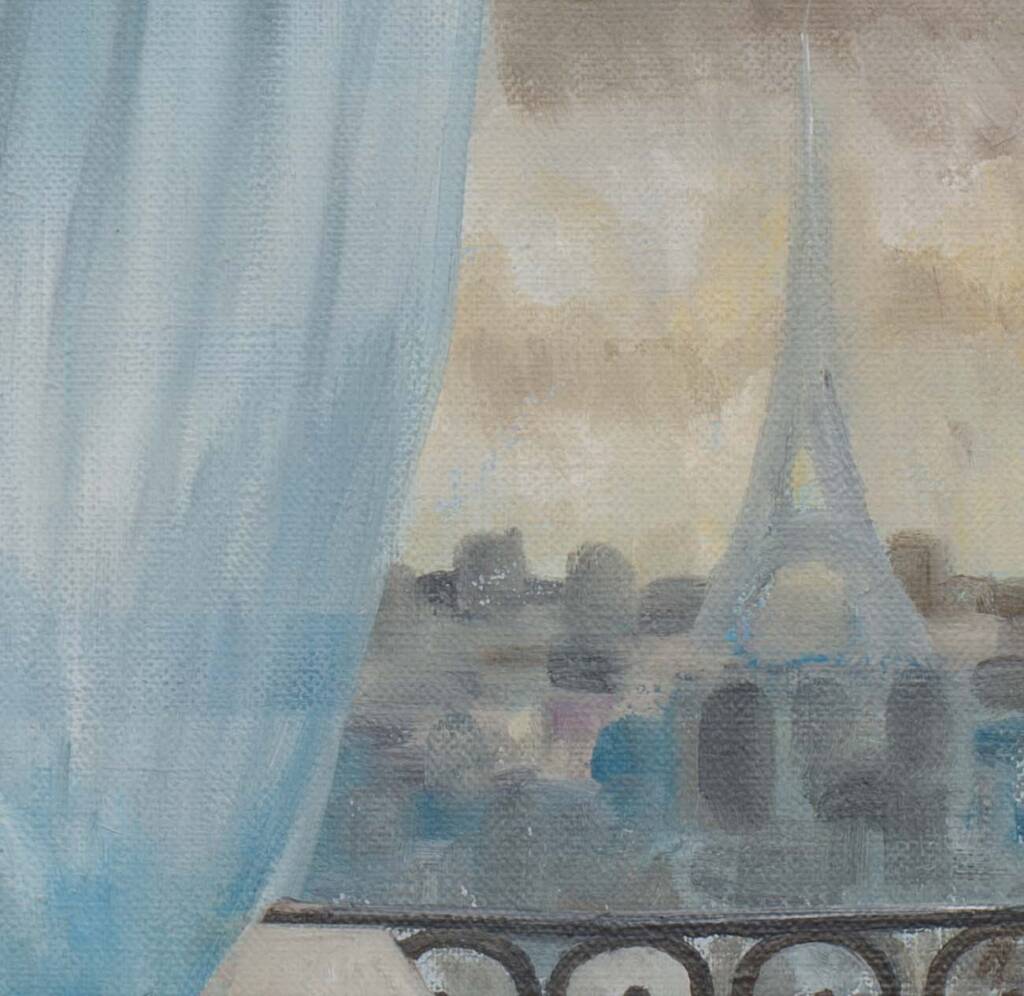 Tende azzurre e leggere incorniciano come un sipario la finestra aperta sul balcone in ferro battuto. Oltre la ringhiera dal disegno elegante, Parigi si distende nella luce incerta di un cielo plumbeo: i tetti cubici, la sagoma inconfondibile della Torre Eiffel che affiora nella foschia. Uno sguardo intimo sulla città, filtrato dalla soglia privata di una stanza.